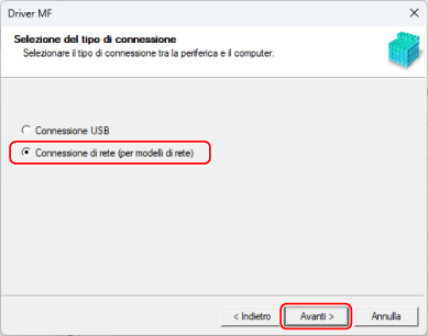 Se viene visualizzata la seguente schermata, selezionare [Connessione di rete (per modelli di rete)] → fare clic su [Avanti].