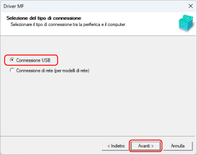 Se viene visualizzata la seguente schermata, selezionare [Connessione USB] → fare clic su [Avanti].