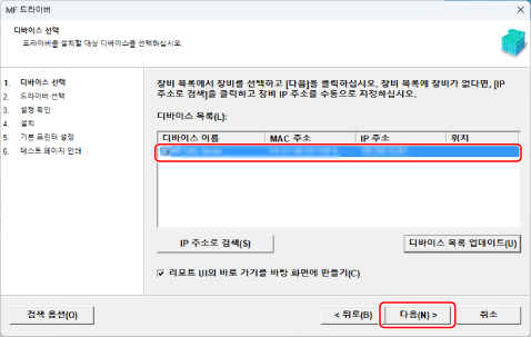 참고[디바이스 목록]에 디바이스가 표시되지 않는 경우 컴퓨터와 디바이스의 연결 상태 및 IP 주소 설정을 확인하고 [디바이스 목록 업데이트]를 클릭합니다. 여전히 디바이스가 표시되지 않는 경우 [IP 주소로 검색]을 클릭 → 디바이스의 IP 주소 입력 → [확인]을 클릭합니다. IP 주소 확인 방법은 디바이스의 설명서를 참조하십시오.