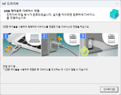 화면의 지침에 따라 USB 케이블을 연결합니다. USB 케이블을 연결하고 설치한 경우 USB 케이블을 분리하고 다시 설치합니다. 또한 이 제품은 USB 케이블이 함께 제공되지 않습니다. 따로 준비하십시오.