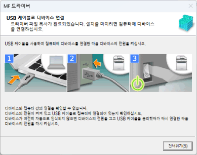 웹 사이트에서 다운로드한 설치 프로그램을 이용해 최신 버전의 MF 드라이버를 설치하는 절차에 대해 설명합니다. USB로 연결된 디바이스에 MF 드라이버를 설치합니다.