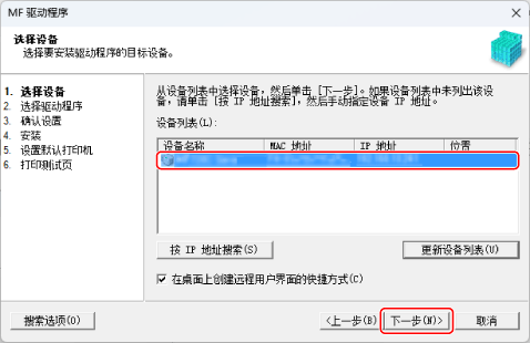 注释如果未在[设备列表]中显示设备,检查计算机和设备之间的连接状态以及 IP 地址设置,并单击[更新设备列表]。如果仍不显示设备,单击[按 IP 地址搜索] → 输入设备的 IP 地址 → 单击[确定]。有关 IP 地址确认方法,请参阅设备手册。