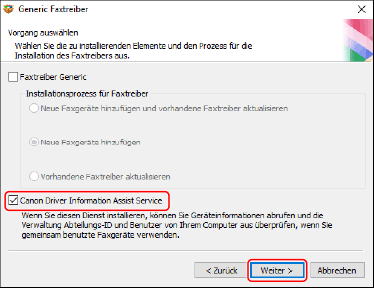 Abbruch der Treiberauswahl → Wählen Sie [Canon Driver Information Assist Service] aus → Klicken Sie auf [Weiter].