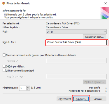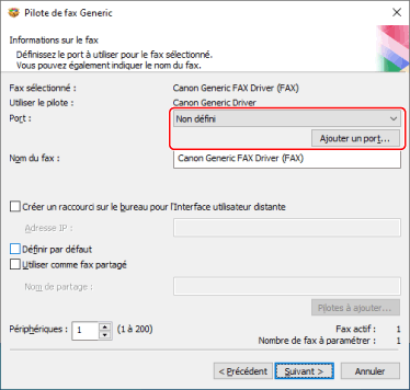 Si vous avez ajouté ou sélectionné un port d'imprimante réseau, vous ne pouvez pas définir les options [Nom du fax] et [Utiliser comme fax partagé].