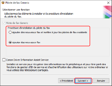 [Procédure d'installation du pilote du fax] : sélectionnez cette option, si nécessaire, si un pilote est déjà installé.
