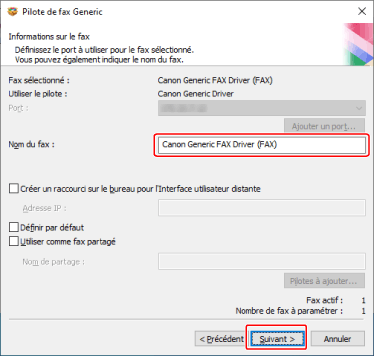 Pour modifier le nom du périphérique ou définir ce dernier en tant que périphérique par défaut, sélectionnez [Définir les informations sur le fax] → cliquez sur [Suivant].