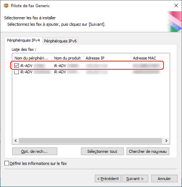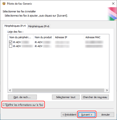 Sélectionnez le périphérique à installer dans l'option [Liste des fax].