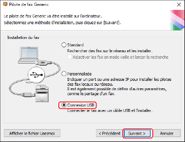 Sélectionnez [Connexion USB] → cliquez sur [Suivant].