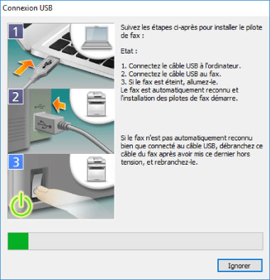 Lorsque l'écran ci-dessous s'affiche, reliez le périphérique et l'ordinateur via un câble USB → allumez le périphérique.