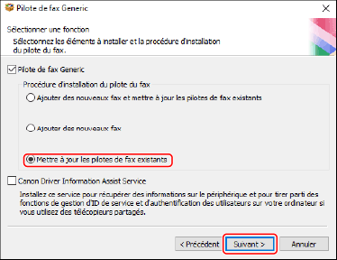 Sélectionnez [Mettre à jour les pilotes de fax existants] pour [Procédure d'installation du pilote du fax] → cliquez sur [Suivant].