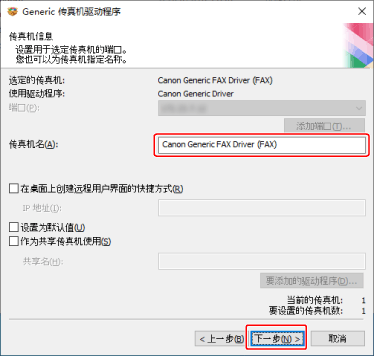 如果要更改设备名称,或将其设置为默认设备,请选择[设置传真机信息] → 单击[下一步]。