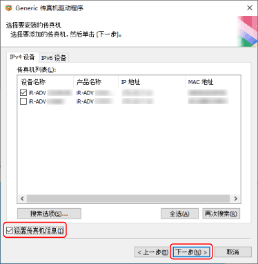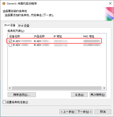 [再次搜索]:如果设备未显示在 [传真机列表] 中,可单击此项。如果重新搜索后设备仍未显示,可选择 [自定义] 并指定一个端口或 IP 地址进行安装。