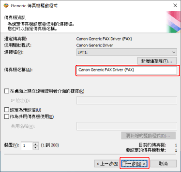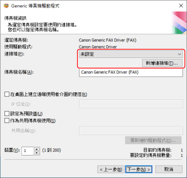 如果您已新增或選取網路印表機連接埠,將無法設定 [傳真機名稱] 和 [作為共用傳真機使用]。