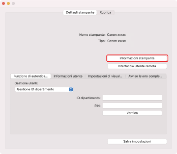 NOTASe il nome del driver visualizzato nella parte superiore della finestra di dialogo [Informazioni stampante] e il nome visualizzato in [Configurazione] > [Nome recuperato dalla stampante] non corrispondono, le funzioni della periferica potrebbero non essere disponibili. In tal caso, cancellare la periferica da [Impostazioni di Sistema] di macOS e registrarla nuovamente.