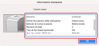 Nella finestra di dialogo [Informazioni stampante], verificare le informazioni sulla periferica → fare clic su [OK].