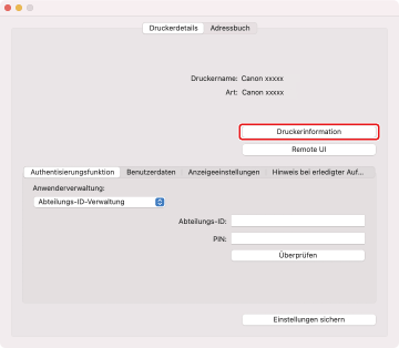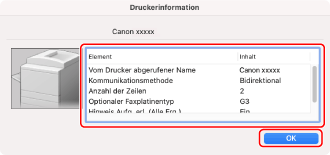 HINWEISWenn der Treibername oben im Dialogfenster [Druckerinformation] angezeigt wird und der in [Konfiguration] > [Vom Drucker abgerufener Name] angezeigte Name nicht mit diesem übereinstimmt, können Sie die Funktionen des Geräts nicht verwenden. Löschen Sie in diesem Fall das Gerät aus den [Systemeinstellungen] von macOS, und registrieren Sie dann das Gerät erneut.