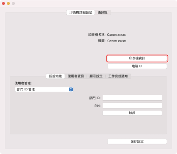 註釋如果顯示在 [印表機資訊] 對話框頂端的驅動程式名稱和 [設定] > [從印表機取得的名稱] 中顯示的名稱不符,則不能使用裝置的功能。如果發生這種情況,請刪除 macOS 的 [系統設定] 中的裝置,然後重新登錄裝置。