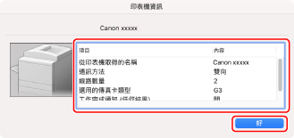 在 [印表機資訊] 對話框中查看裝置資訊 → 按一下 [好]。
