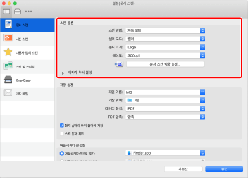 [설정] 대화상자의 왼쪽에 표시된 항목 중 하나의 아이콘을 선택한 후 오른쪽에 표시된 패널에서 필요한 항목을 설정합니다. 설정한 항목은 주 대화상자에서 스캔할 때 적용됩니다.