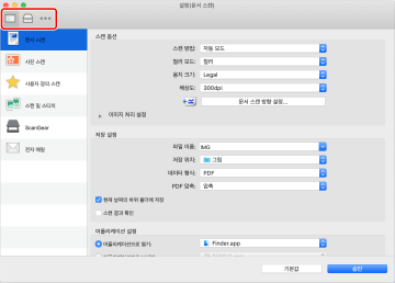 스캔 세부 사항을 설정하고 스캔을 시작하는 ScanGear MF 대화상자를 표시합니다.
