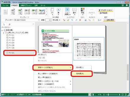ページツリーで、(2章) [サンプル]見開き原稿のページ1を選択し、右クリックして[原稿ページの回転] > [右90度]を選択します。