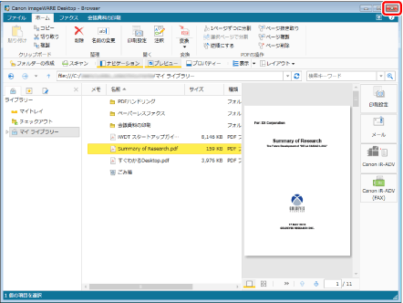 Desktop Browserは、前回終了した時点でのウィンドウ表示の状態で起動します。ただし、ナビゲーションウィンドウは、前回終了時に[検索条件]タブを表示していた場合でも、再起動時は[ライブラリー]タブが表示されます。
