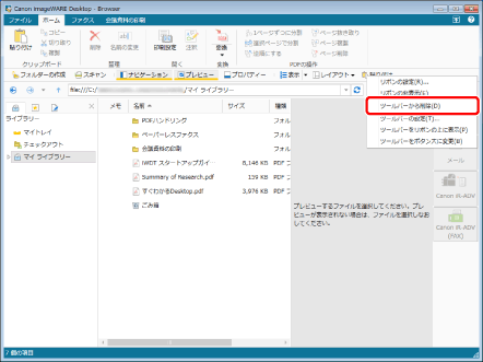 ツールバーに表示するボタン、グループを追加/削除して、ツールバーをカスタマイズできます。