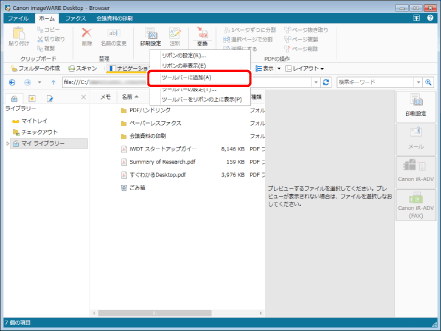 アウトプットバーに登録されているボタンも、Desktop Browserのツールバーにボタンとして追加できます。