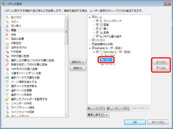 タブ、グループ、および追加したコマンドの並び順を変更する場合は、右側の一覧から並び順を変更するタブ、グループ、またはコマンドを選択して、[上へ]/[下へ]をクリックします。