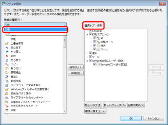 [リボンの設定]ダイアログボックスの左側の一覧から選択して、リボンに追加したグループには、コマンドを追加できません。