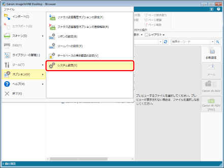 [ファイル]メニュー > [オプション] > [システム設定]を選択します。