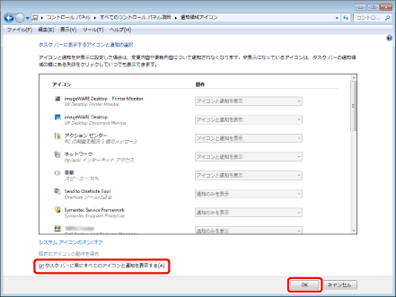 Printer MonitorとDocument Monitorのアイコン表示設定のみを変更したい場合は、次のアイコンの設定を[アイコンと通知を表示]に変更します。
