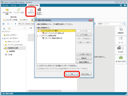 「会議資料の印刷」フォルダーを選択し、[サンプル]プレゼン資料.pdfと[サンプル]見開き原稿.tiffを[Shift]キーを押しながら選択します。