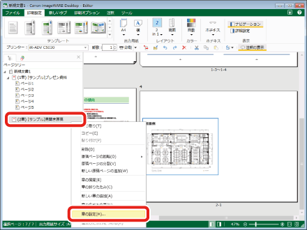 ページツリーで、(2章) [サンプル]見開き原稿を選択し、右クリックして[章の設定]を選択します。