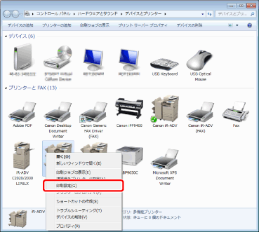[デバイスとプリンター]画面、および[プリンタ]画面を表示させる方法は、次を参照してください。