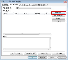 Canon Generic FAX Driverを使用している場合、[宛先選択]タブで[アドレス帳の編集]をクリックし、表示された[アドレス帳の編集]ダイアログボックスで[個人の追加]をクリックします。