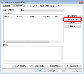 Canon Generic FAX Driverを使用している場合、[宛先選択]タブで[アドレス帳の編集]をクリックし、表示された[アドレス帳の編集]ダイアログボックスで[グループの追加]をクリックします。