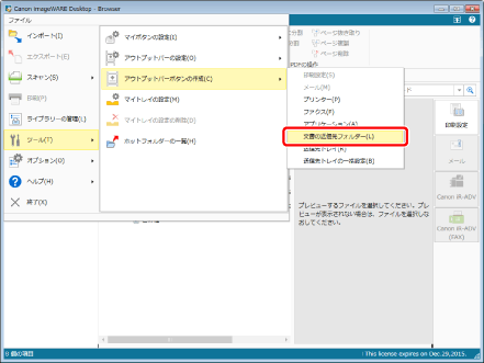 Desktop Editorからも文書の送信先フォルダーを作成できます。Desktop Editorから文書の送信先フォルダーを作成する場合は、[ファイル]メニュー > [登録/管理] > [文書の送信先フォルダーの作成]を選択します。