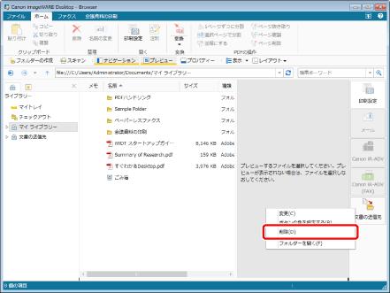 Desktop Editorからも文書の送信先フォルダーを削除できます。Desktop Editorから文書の送信先フォルダーを削除する場合は、[ファイル]メニュー > [登録/管理] > [文書の送信先フォルダーの設定] > (文書の送信先フォルダー名) > [削除]を選択します。