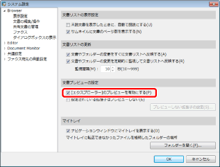 Desktop Browserのプレビュー機能は、Windowsエクスプローラーのプレビュー機能と同様のものです。Windowsエクスプローラーのフォルダーオプションで[プレビューウィンドウでプレビューのハンドラーを表示する]の設定とは無関係に、Desktop Browserの設定を有効にすることでOffice文書のプレビュー表示ができます。プレビュー表示は、ファイルタイプごとに実行されるため、まれに特定のファイルにおいてプレビュー表示ができないなどの問題が出る場合があります。このような場合は、Windowsエクスプローラーでプレビュー表示できるかどうか確認してください。