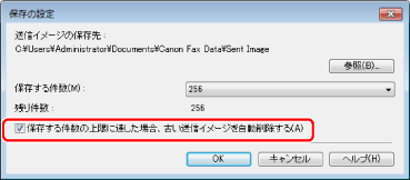 Canon Generic FAX Driverを使用している場合、印刷設定の[保存する件数]で設定されている件数を超えると、ファクスを送信するごとに確認メッセージが表示されます。表示させないようにするには、[保存する件数の上限に達した場合、古い送信イメージを自動削除する]にチェックマークを付けてください。詳細については、次を参照してください。