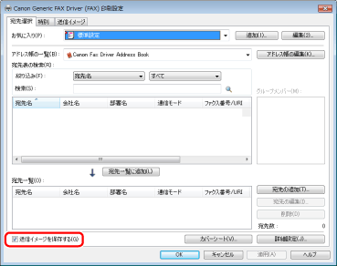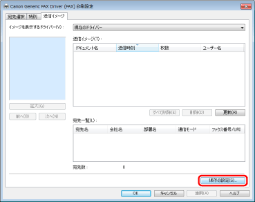 Canon Generic FAX Driverの印刷設定で[送信イメージを保存する]にチェックマークが付いている