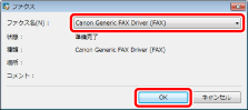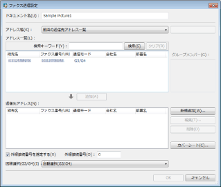 [ファクス送信設定]ダイアログボックスには前回送信したときの設定値が反映されています。宛先を追加、または削除して、そのままの状態で[OK]をクリックすることで、前回と同じ設定で送信できます。