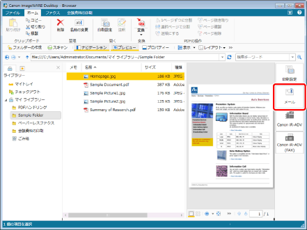 メールに添付して送信する文書をファイルリストビューウィンドウで選択します。