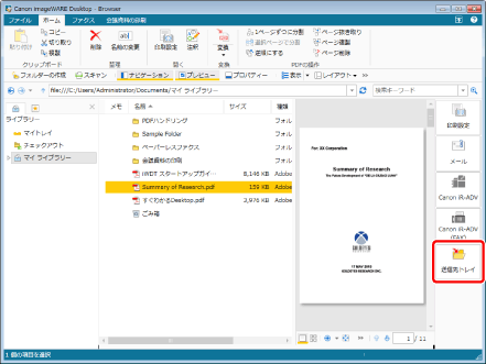 送信先トレイアウトプットボタンの設定で[文書の操作]が[移動する]に設定されている場合、送信した文書はDesktopから削除されます。送信した文書をDesktopに残す場合は、[コピーする]に設定してください。送信先トレイアウトプットボタンの設定については、次を参照してください。
