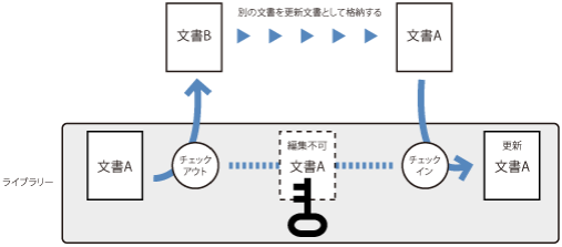 他のユーザーがその文書を編集できない状態をつくるためにチェックアウトを行い、別の文書を更新文書として格納する場合も、チェックインを行います。
