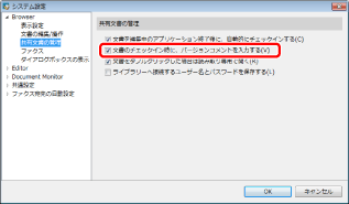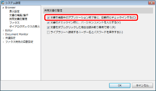 [システム設定] > [Browser] > [共有文書の管理] > [文書を編集中のアプリケーション終了後に、自動的にチェックインする]