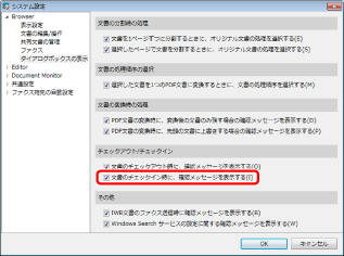[システム設定] > [Browser] > [ダイアログボックスの表示] > [文書のチェックイン時に、確認メッセージを表示する]のチェックマークを付けると表示され、外すと表示されなくなります。