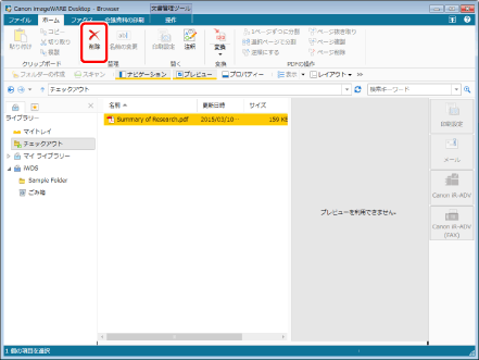 ファイルリストビューウィンドウで文書を選択して、リボンの  (削除)をクリックします。