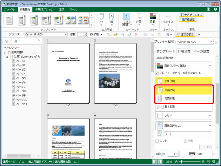 キヤノン製プリンターを選択し、詳細ウィンドウの[印刷設定]タブ、リボンのコマンド、ツールボタンのいずれかで、[Editorの印刷設定を使用]にチェックマークを付けた場合に設定できます。